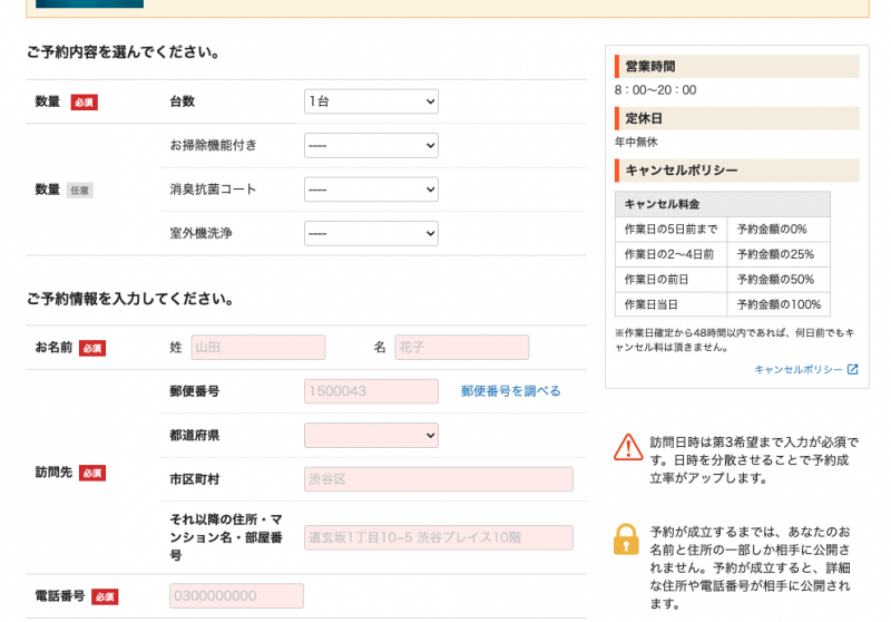 頼みたい業者が決まったら予約日時を入力します。